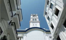Customs House Clock Tower with the Rice Miller Hotel to the left and the residences to the right