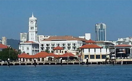 View of the Rice Miller roof line and iconic clock tower taken from the sea off Weld Quay